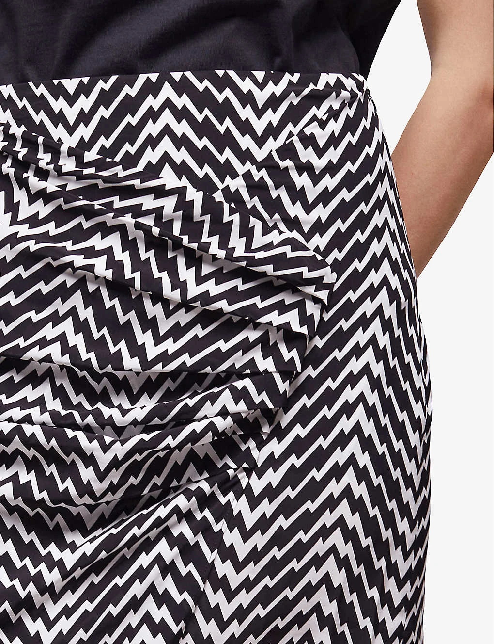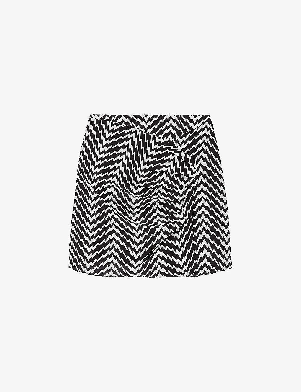 - Slim fit, high waist, mini length, all-over graphic zigzag print, draping and gathering at front, asymmetric hem