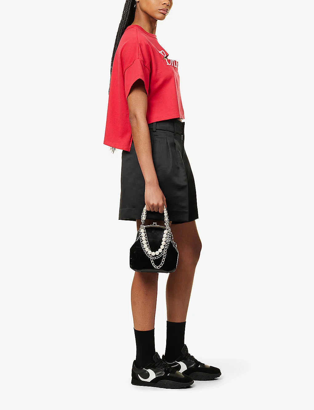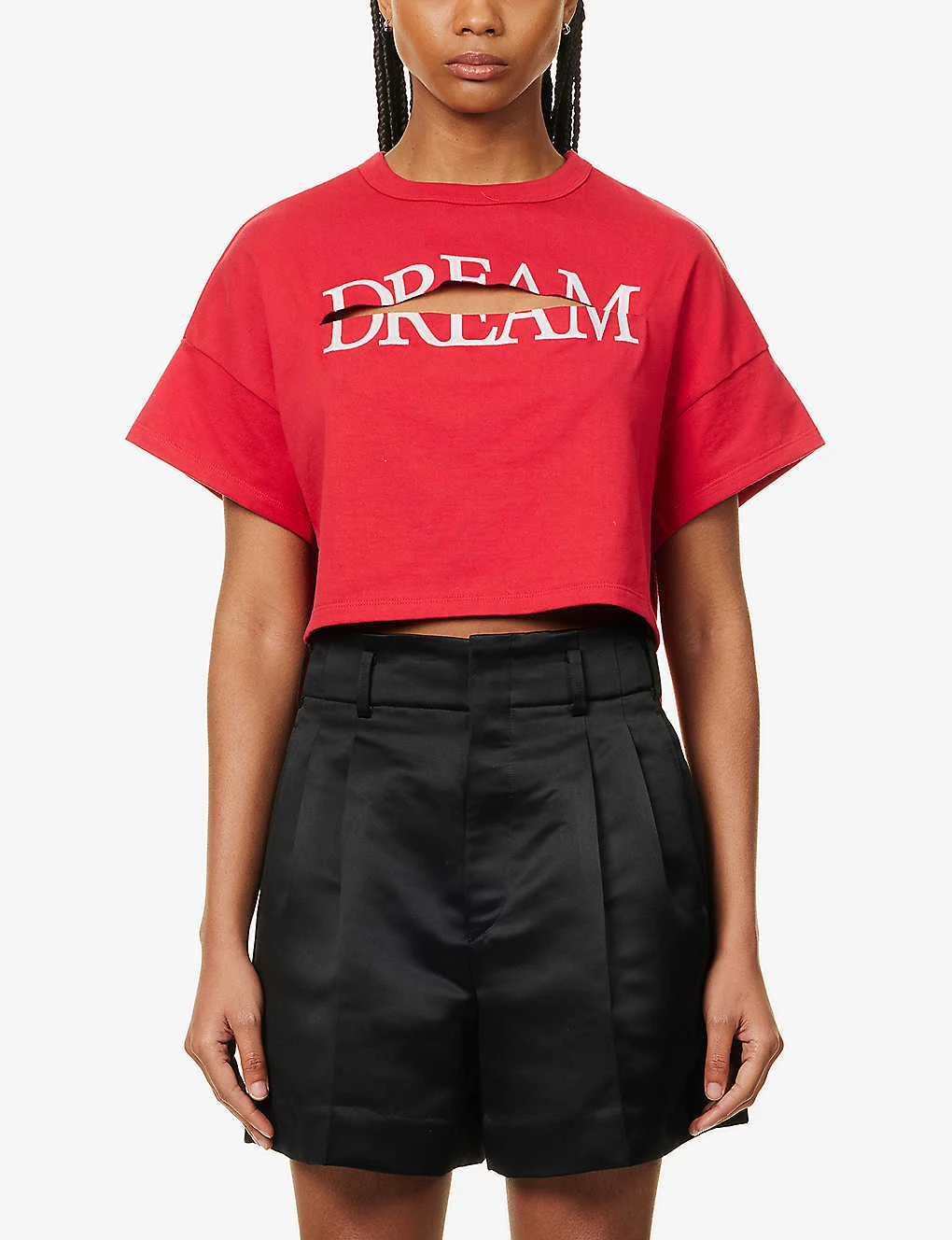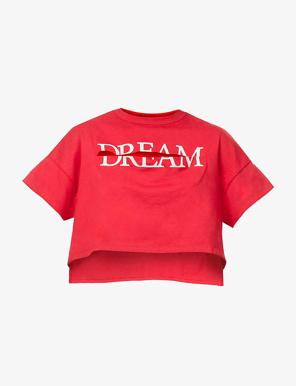 - Relaxed boxy fit, round neck, ribbed trim at neck, short sleeves, contrast embroidered text at front, slash design at front, dipped hem