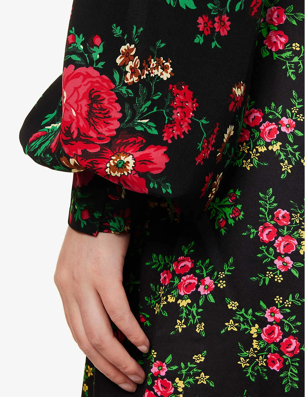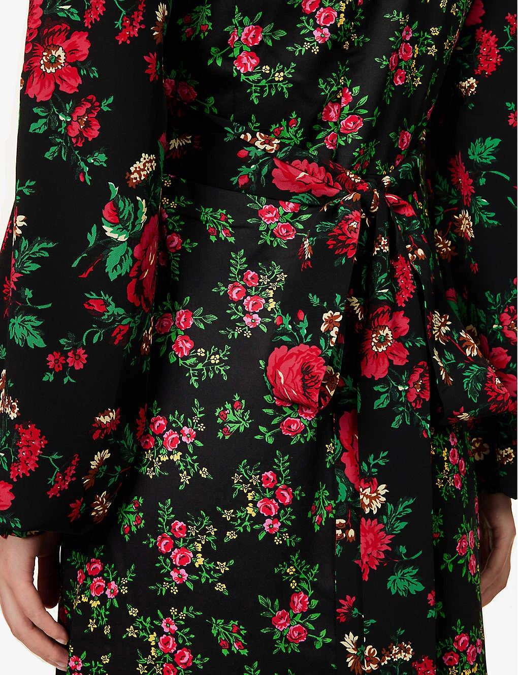 - Regular fit, round neckline, padded shoulders, contrast long sleeves, buttoned sleeve hems, self-tie at waist, all-over floral pattern, flared hem