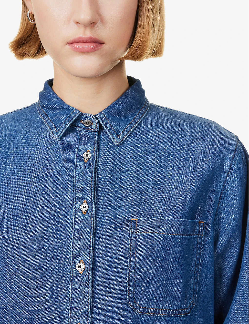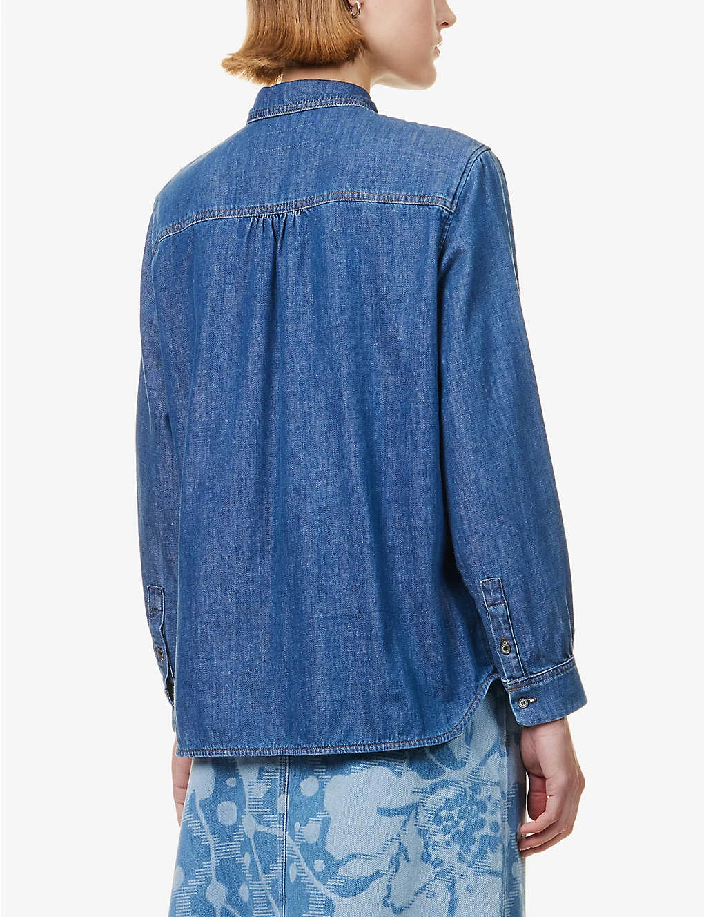 - Regular fit, collar, long sleeves, buttoned sleeve hems, patch pocket at chest, straight yoke with gather at back, contrast stitching, mid-wash, curved hem