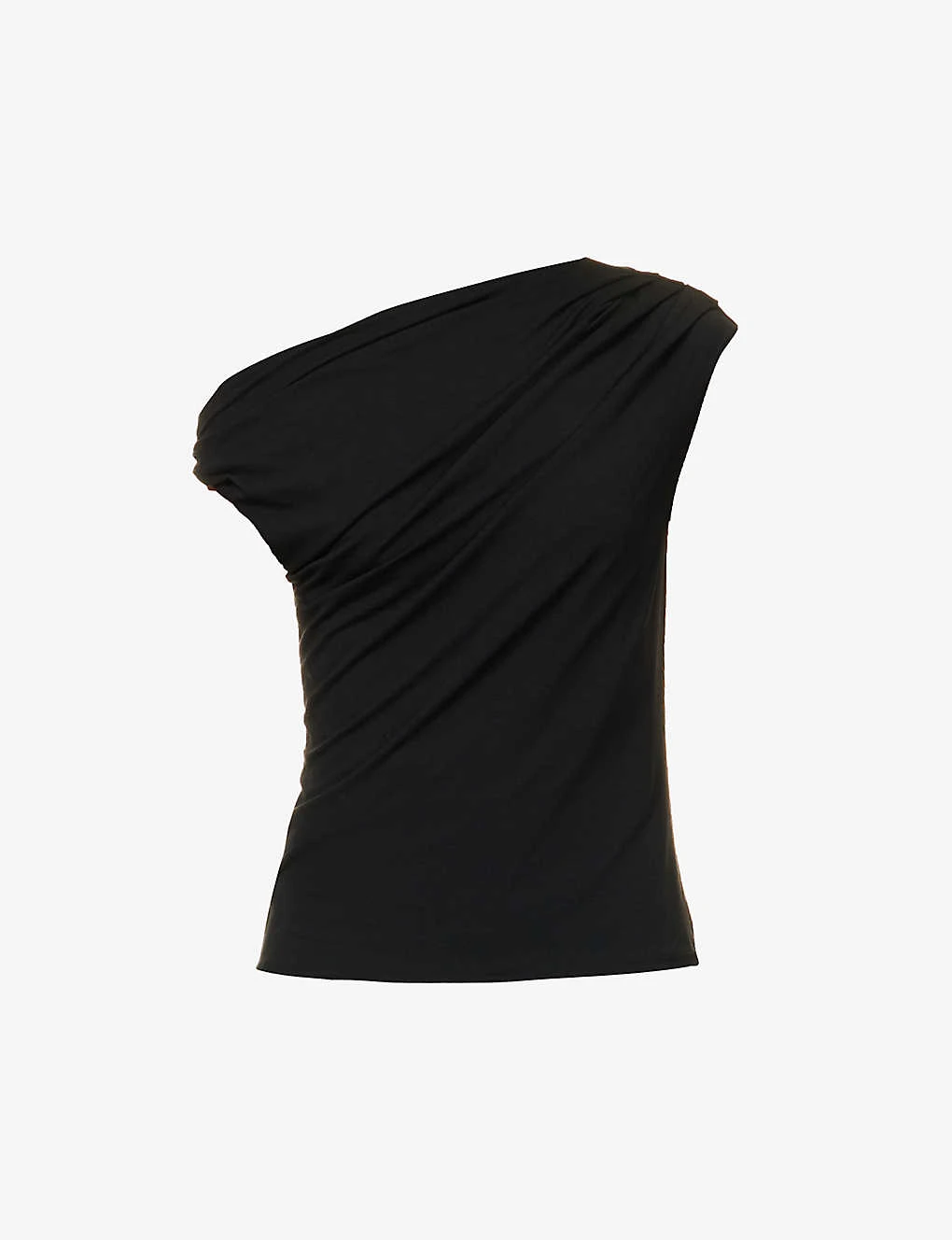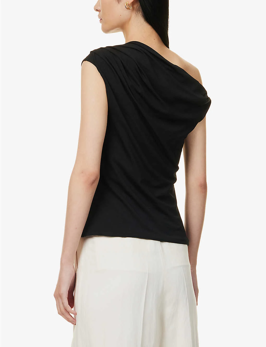 - Slim fit, asymmetric neckline, sleeveless, draped design at front and back