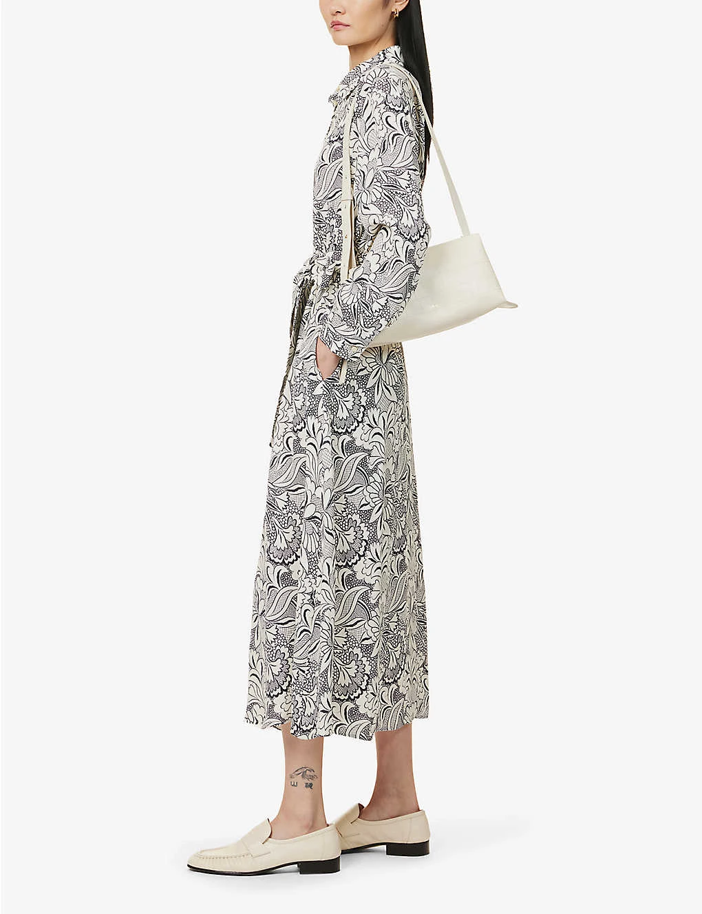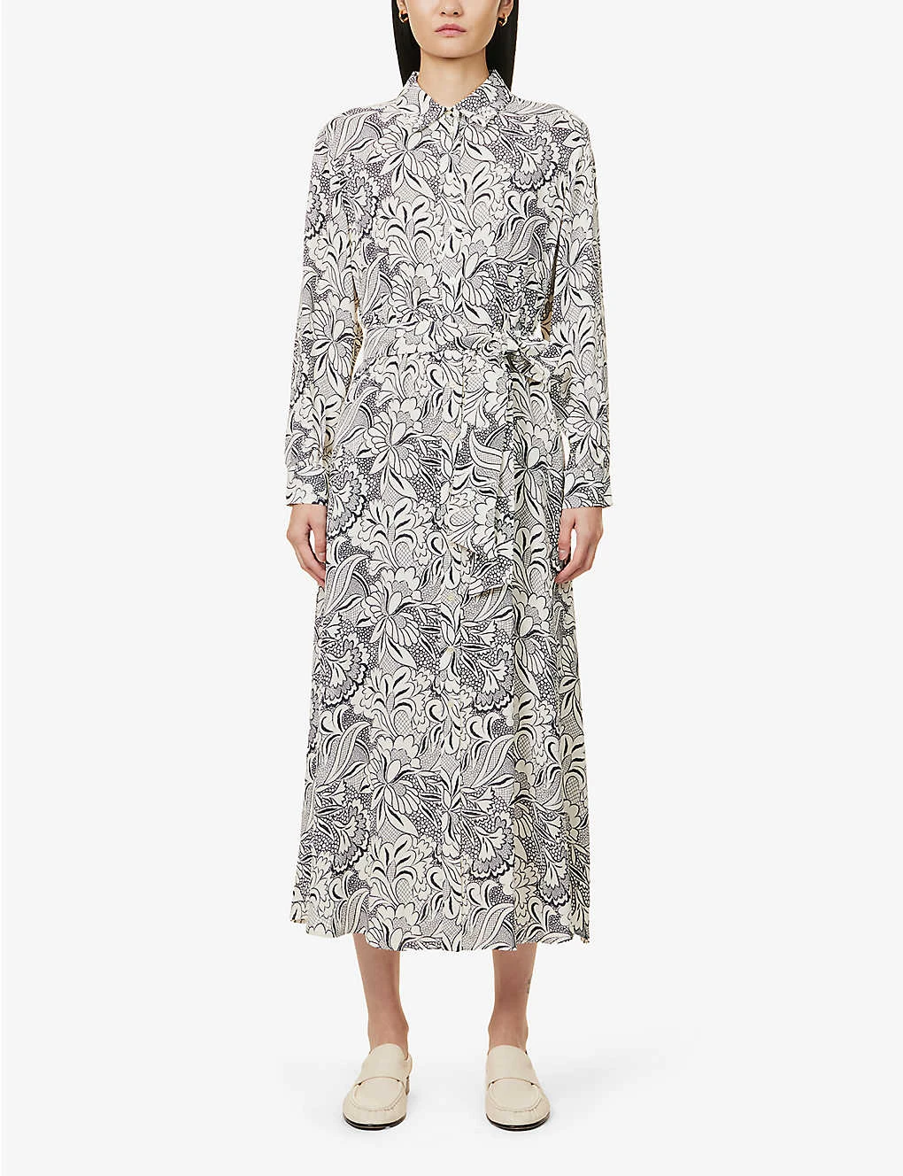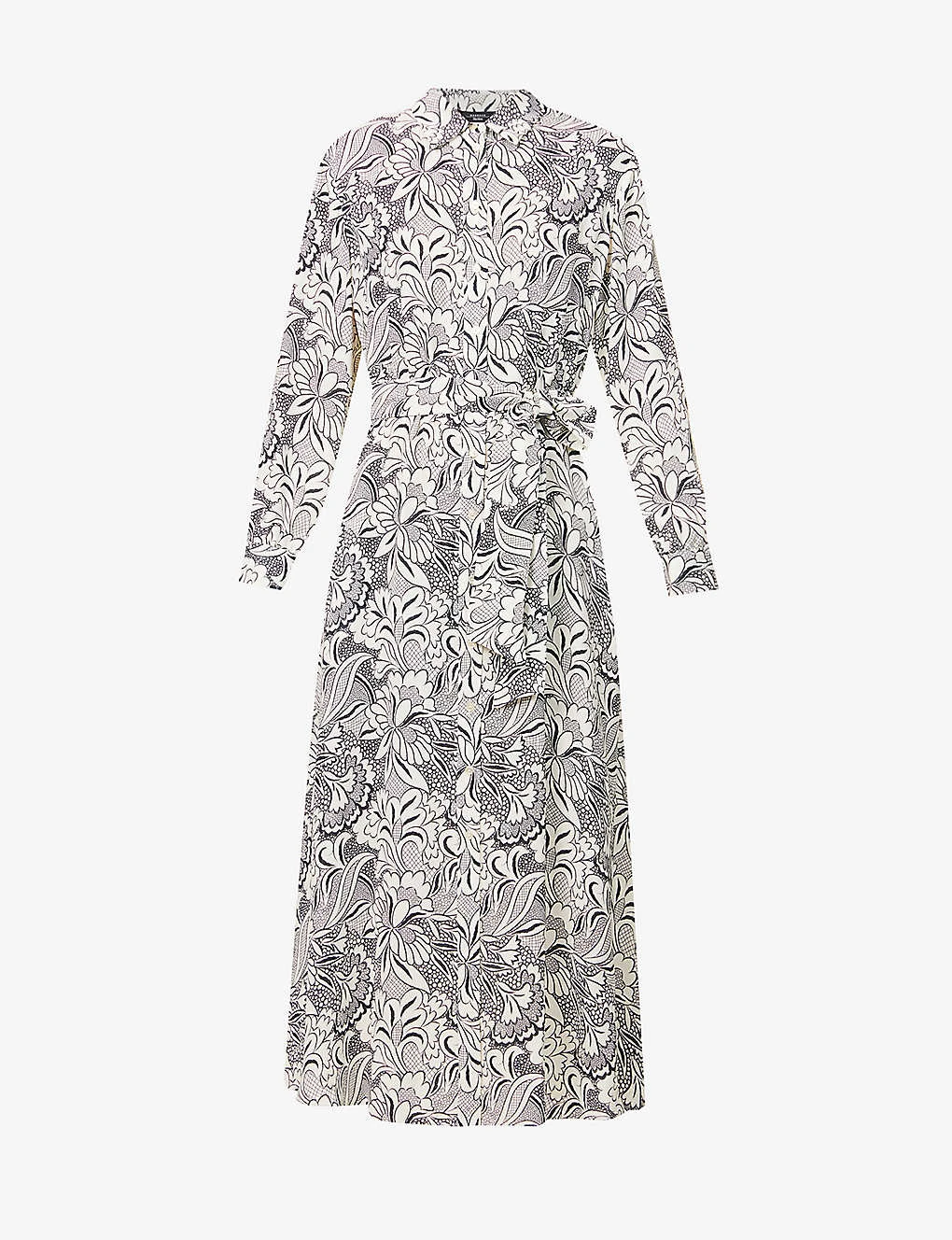 - Regular fit, collar, long sleeves, buttoned cuffs, gathered at waist, two slip pockets at sides, detachable self-tie fastening, all-over print