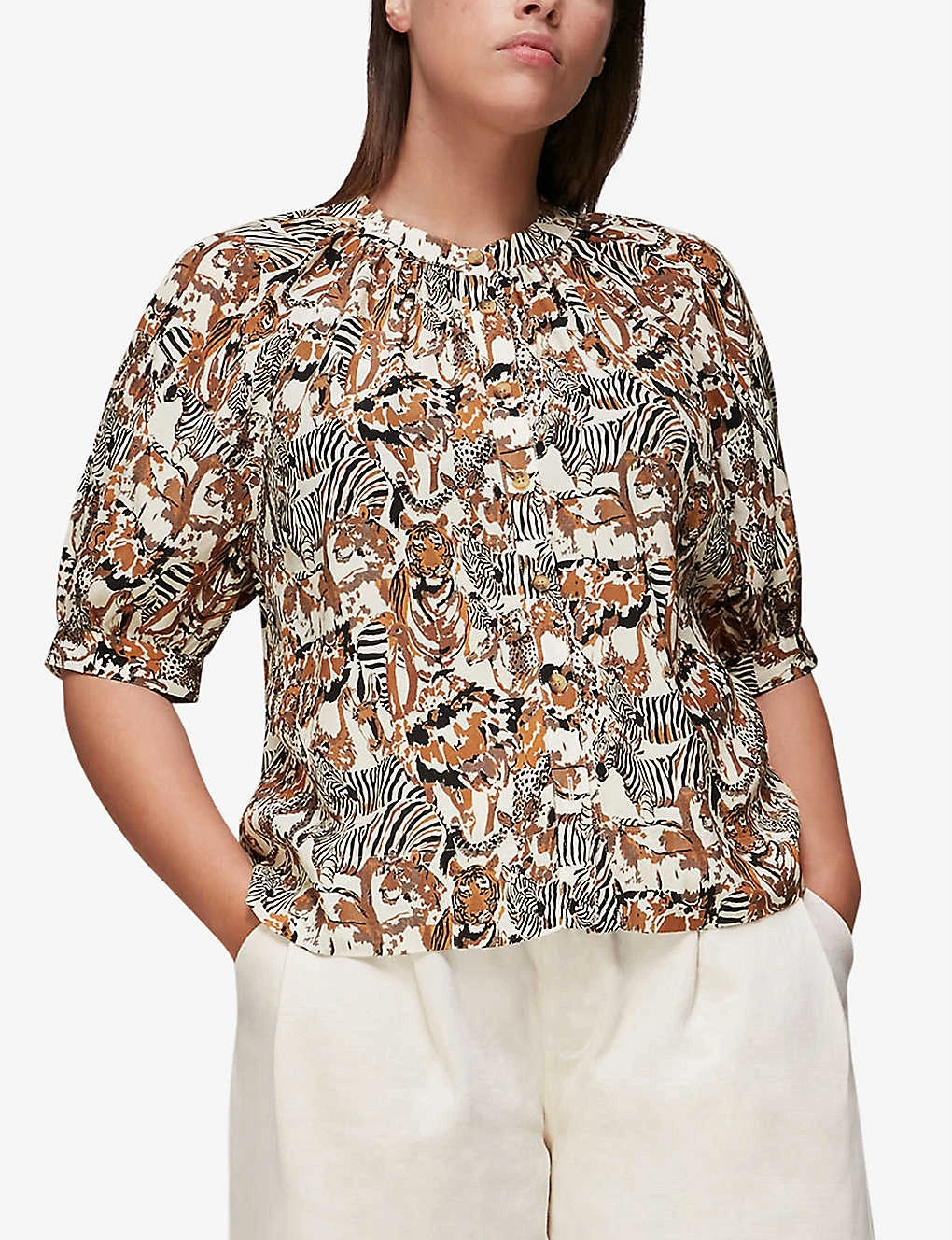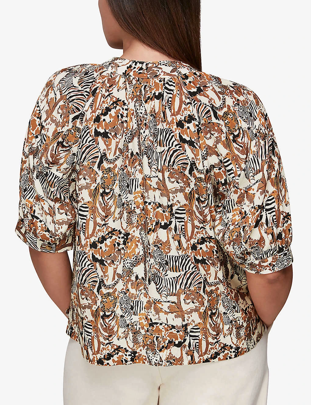 - Round neck, gathered detailing around neckline and cuffs, short sleeves, all-over safari print, relaxed fit