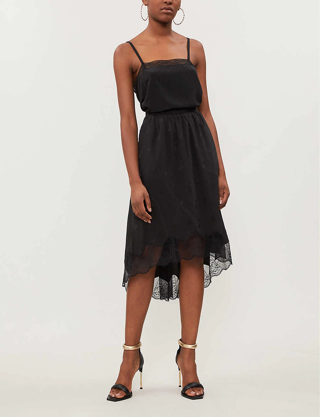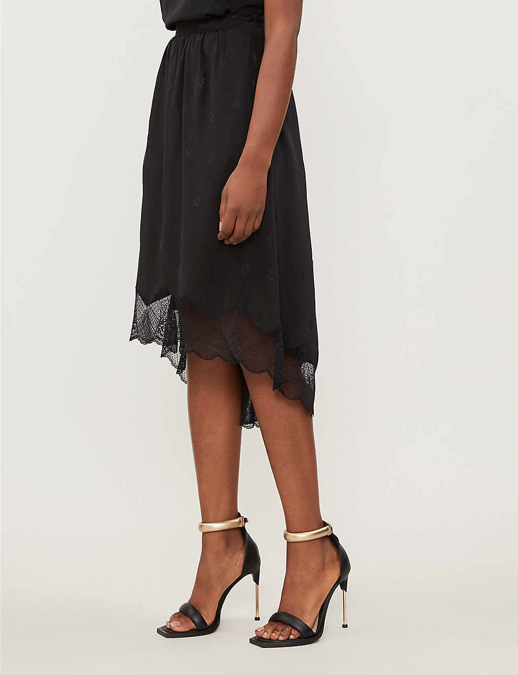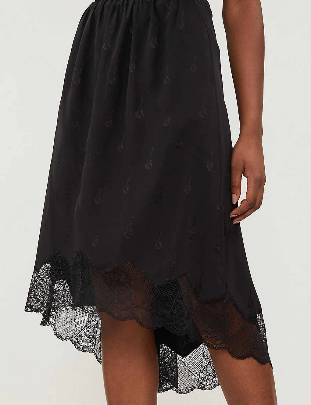 Zadig & Voltaire silk skirt Slips on High-waist, elasticated waistband, seam pockets at side, all-over guitar print, scalloped lace trim at hem, dipped hem at back 100% silk; 88% nylon, 12% elastane Machine wash cold Size s: Length 29″” Model is 5ft 10″” and wears a size small