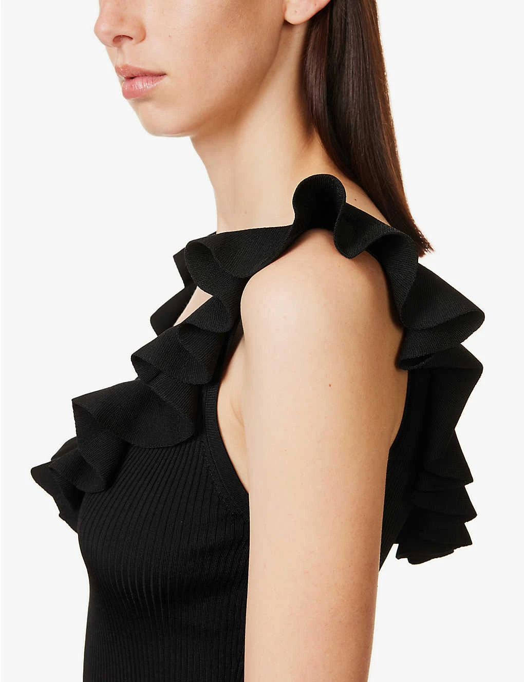 - Slim fit, V-neckline, ruffle overlay at neck, sleeveless, ribbed knit texture