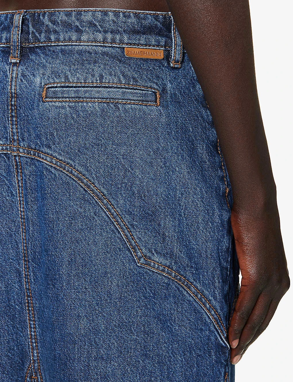 - Regular fit, mid-rise, structured waistband with belt loops, five pockets, brand tag at back, panelled pattern, mid-wash, contrast stitching, branded hardware, flared hem